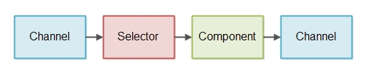 我们的组件(Component)通过Selector检查当前Channel是否有数据需要写入。此时component读入数据,并且根据输入的数据input对外提供数据输出output。这个对外的数据输出output被写到了另一个Channel中。