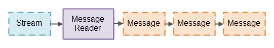 IO管道通常直接从流中(来自于socket活file的流)读取数据,然后把数据分割为连续的消息。这个处理与我们读取流信息,用tokenizer进行解析非常相似。不同的是我们在这里会把数据流分割为更大一些的消息块。我把这个过程叫做Message Reader.下面是一张说明的插图:
