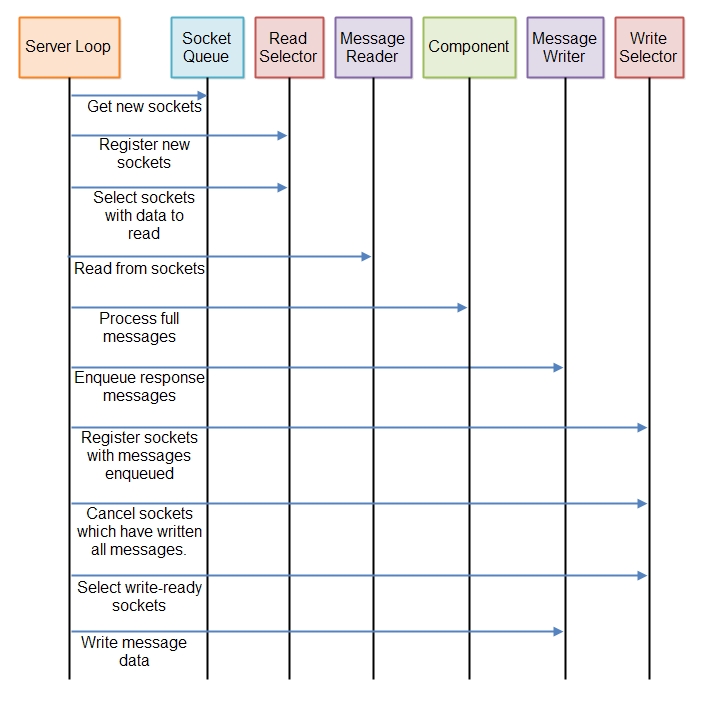 一个Message Reader自然是协议相关的。他需要知道message的格式以便读取。如果我们的服务器是跨协议复用的,那他必须实现Message Reader的协议-大致类似于接收一个Message Reader工厂作为配置参数。